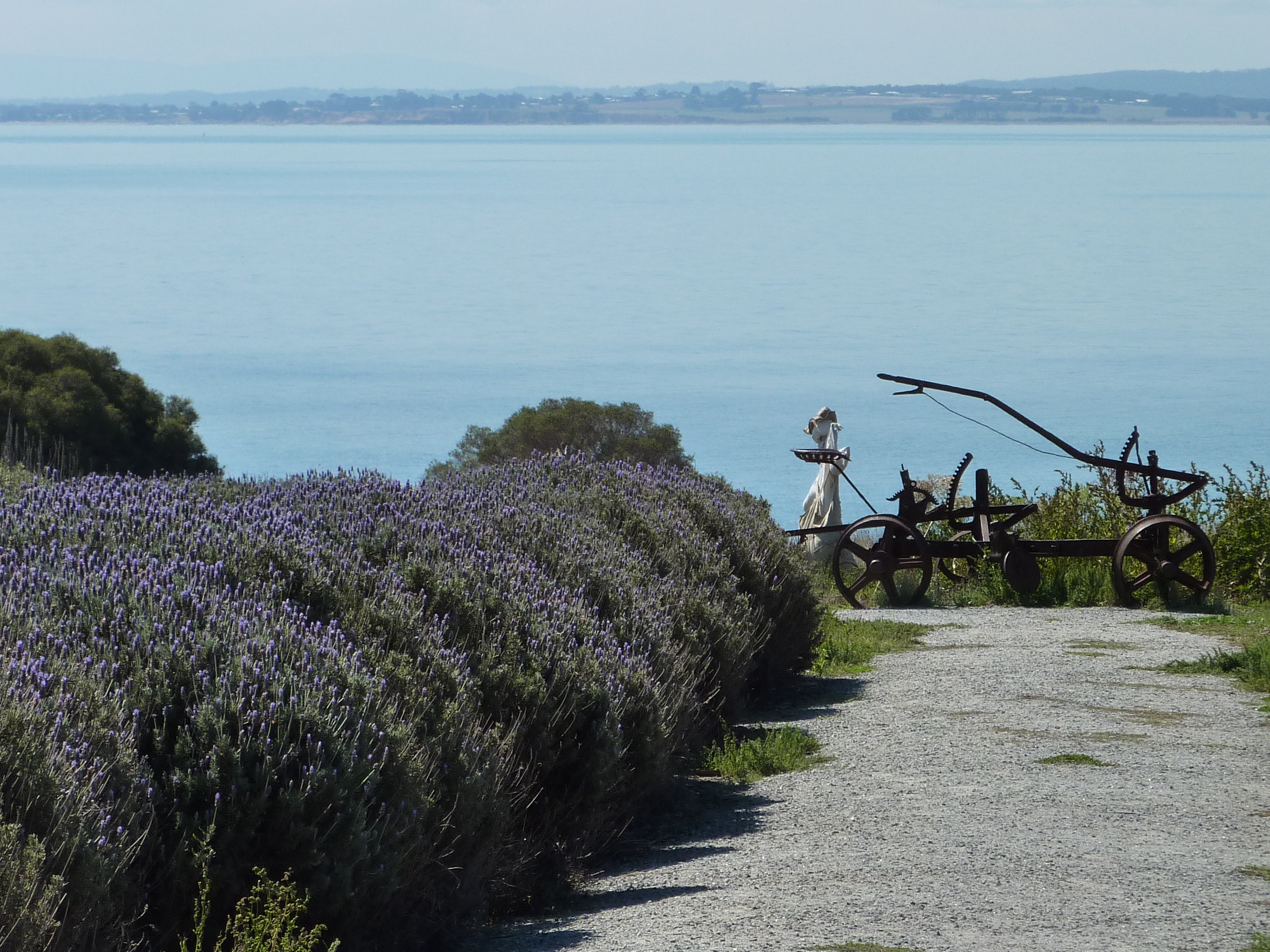 A small wooden bridge off of the main Island leads to Churchill Island, with sheep, cows, gardens and a heritage farm. We lunched on the lawn by the visitor centre, with an extensive view across the bay to the mainland. A field of lavender led from the lawn down toward the sea, and I took Bridget to go and smell the flowers, but she decided not to go because she was “scared of the farmer”, even after being told that “the farmer” didn’t mind.