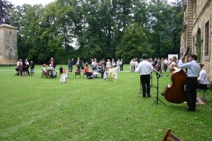 Fortunately the wedding day was glorious. The morning Civil Service at the local Town Hall (more of a village really) was a relaxed informal affair. We noted a few small café’s and bars in the village, and returned there for lunch. Why do French Café’s close for lunch? How does that work? We ended up with a greasy pizza in the suburbs of Valence, which made us late setting off for the church wedding, 40 minutes away. But we made it with a few minutes to spare. The service was in French, of course, but with “sub-titles”, ie half of the service book was in English, to help us to follow the service. This didn’t help with all of the sung prayers – I just wailed along as best I could. We then paraded the half mile along a country road to the Chateaux where the reception was to be held. Not good for ladies in high heels. As you would expect, we lined up to be greeted by the wedding couple. The French tradition of everyone kissing the Groom was a bit disconcerting – thank goodness Julian shaved twice before the ceremony.