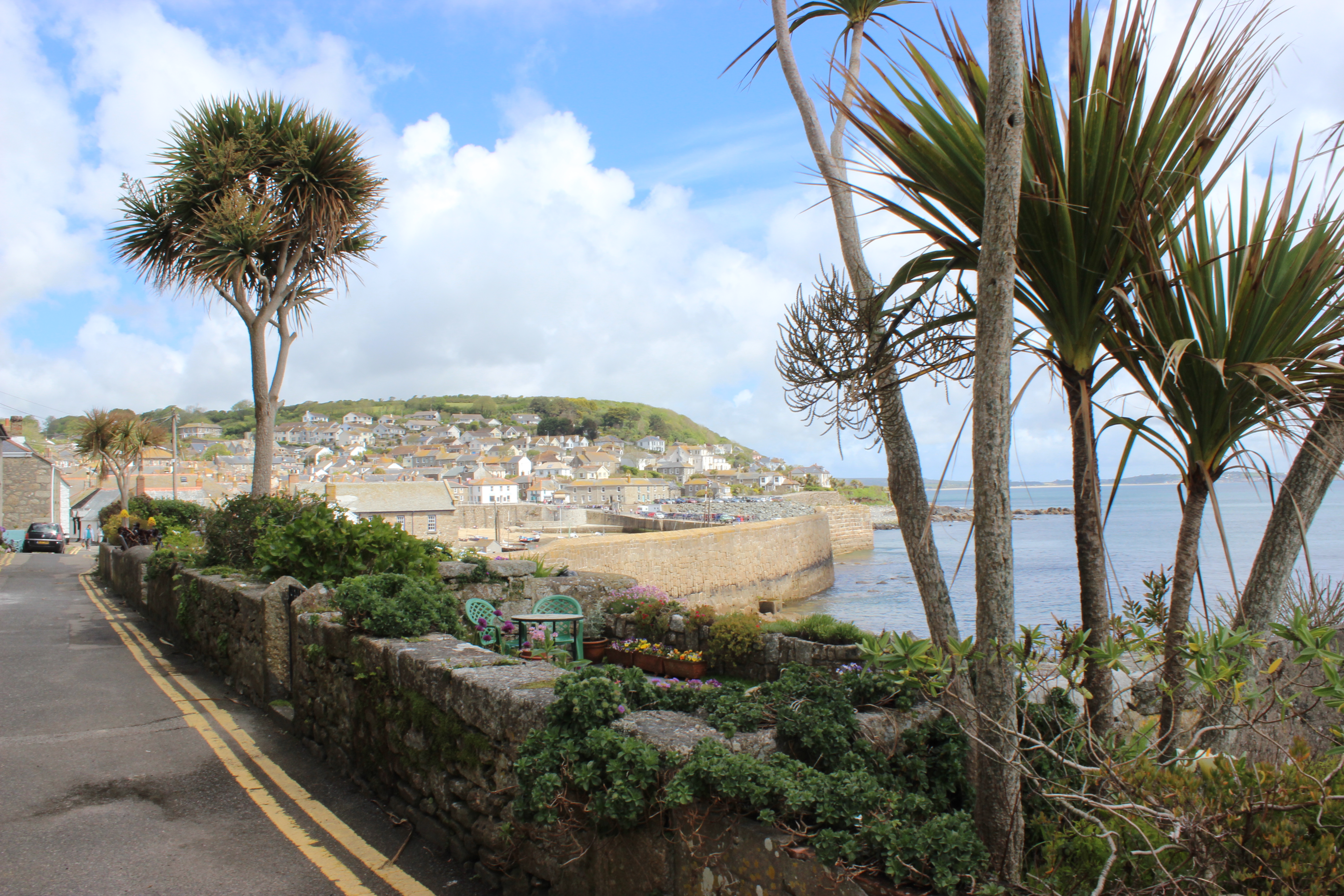 Our journey down was a bit more rushed. We decided to leave late, after lunch, to avoid holiday traffic, to arrive after the rain over Cornwall had headed east, and to ensure that we would get a car parking space on arrival. Mousehole is a small fishing village, with cottages clustered around the harbour, and rising up the hillside inland.