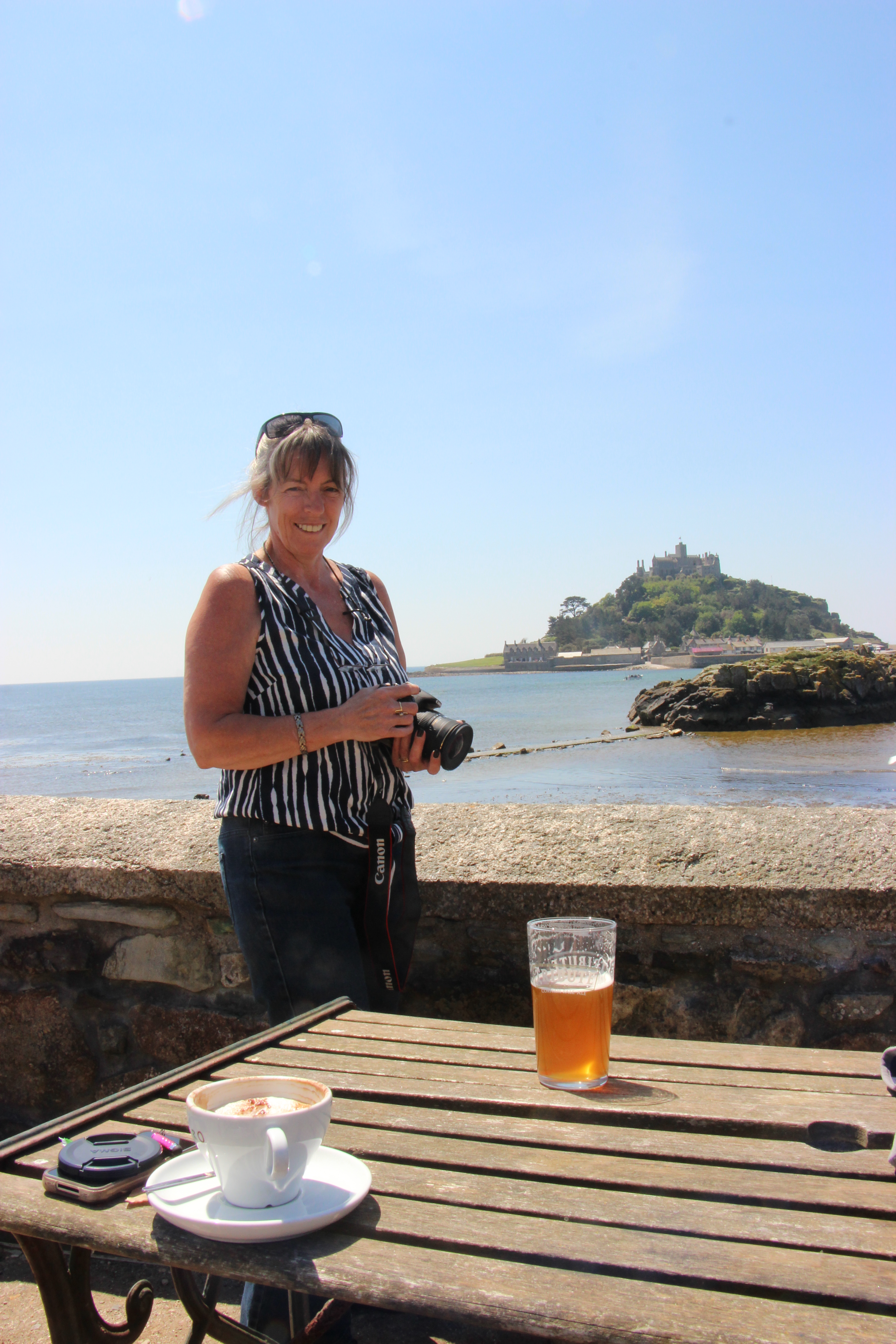 We arrived at Marazion soon after noon, had three hours to wait, and so we had no option but to find a table on a pub terrace overlooking the causeway, and just wait….