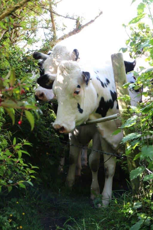 We woke on the first morning to a bright and sunny, if breezy, day. On our previous visits I had walked the dogs while Chantal cooked a full breakfast, but this time I was pleased when Chantal agreed to come dog walking with me at the start of the day. A steep slippery path from the top of Duck Street leads up to the hill behind Mousehole, and Chantal struggled up behind me and the dogs, muttering that she hoped we wouldn’t have to slide back down again. I reassured her that my plan was to descend back into the village by another, less steep route. The local livestock had a different idea – when we got to the stile at the top, we were ambushed…