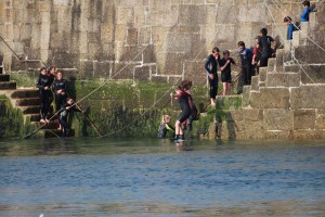 The nature of Mousehole changes in the evening, with less bustle as the day visitor leave, but still busy as people living or staying locally head for the pub or restaurants, and local children emerge to play, with many wearing wet suits to enjoy the popular pastime of leaping into the harbour – youngsters from the steps leading down to the water, while the “youths” dive off the top of the high harbour walls.
