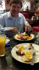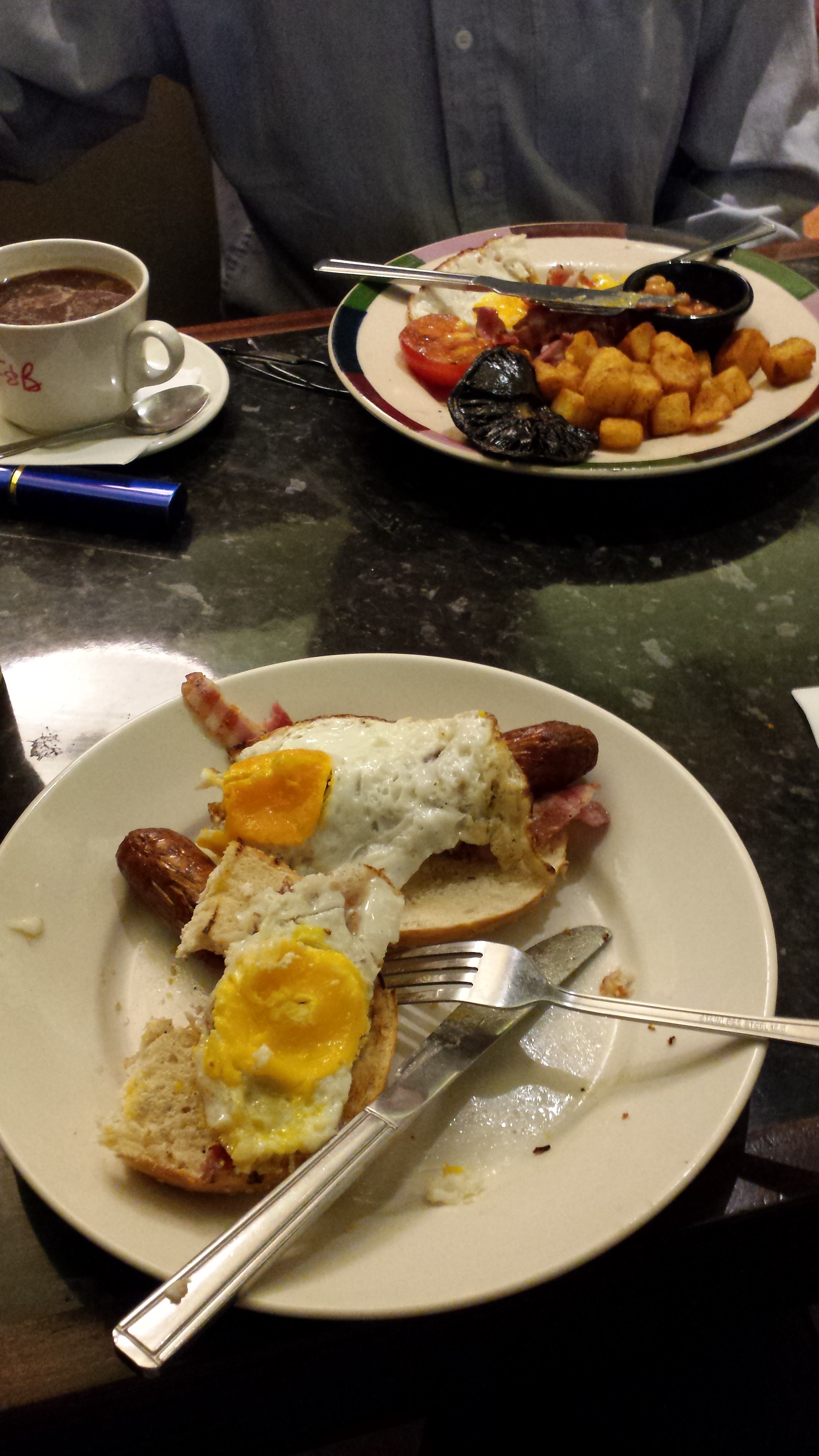 Simon and I had another meal together on Tuesday. Simon suggested that, as a change from our usual weekly lunch, we would have breakfast at the recently opened Frankie and Benny’s in Leicester’s Highcross shopping Centre. Naturally I opted for the Full English, whereas Simon chose Muffins, which actually turned out to be bagels, either which seem to be unnatural breakfast companions. The breakfast was perfectly reasonable, although another sausage would have been nice. Since Frankie and Benny’s have an American theme I should have known better than to order tea, which arrived as a tea bag on a piece of string, suspended in tepid water. For my second drink I ordered coffee. Fortunately the background music, which also had an American theme, circa 1960, was mostly drowned out by hammering and sawing from shop fitters in the adjacent unit. However we had a lovely time, enjoying each other’s company (at least I enjoyed Simons’ company – I assume that he enjoyed mine) and a substantial breakfast before returning to our respective offices.