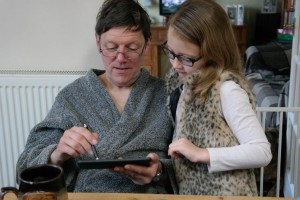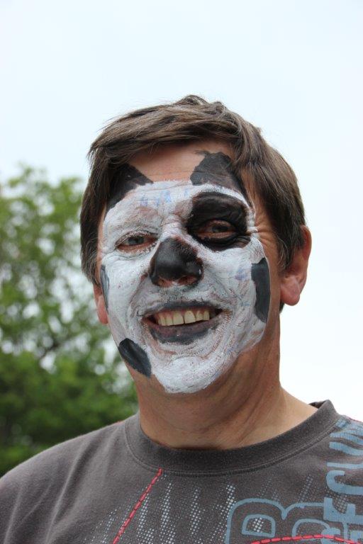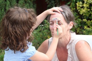 By now Bridget had finished creating invitations for her forthcoming birthday event, on the computer in the study, and joined us outside, where the girls decided that Grannie and Grandpa’s faces were in need of improvement (in my case they were probably right), with the aid of face-paints . Megan painted rainbows onto grannie, before changing her mind and starting a more abstract design, and eventually settling on turning Grannie into a cat (at least that is what I think it was). Bridget was more consistent, spending time creating a Dalmatian, applying a thick layer of black and white paint over my wrinkles.