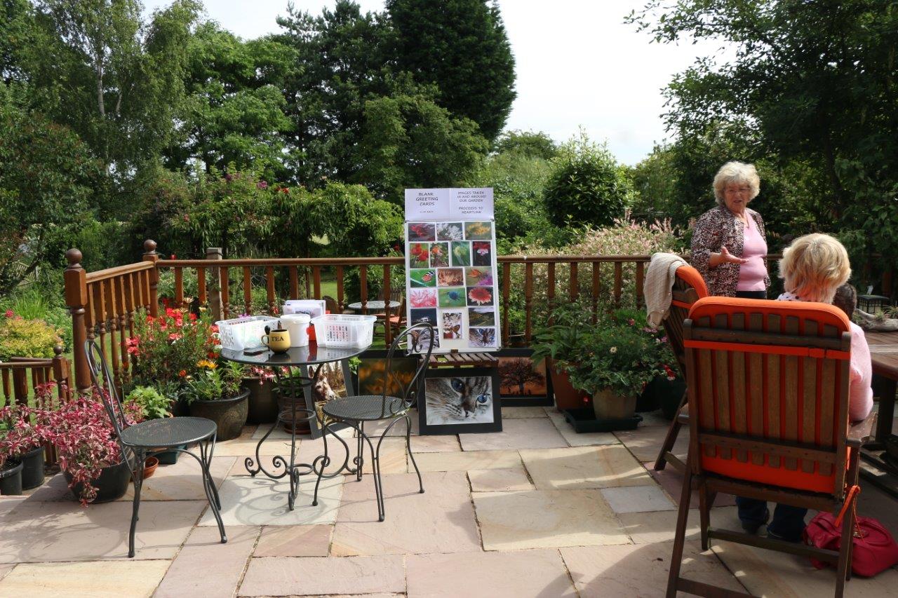As well as being open for “inspection” each garden has a stall or similar to raise extra funds – plant sales, bric-a-brac, raffle, ploughman’s lunches, cream teas, and in our case gift cards. Chantal produced professional-looking gift cards from photos taken in and around our garden, suitably presented with an envelope and cellophane packaging, and sold 89 of them, all profits going to Heart Link. We weren’t sure what would sell, and so we printed four of each of about a dozen designs. We found that birds, particularly a robin, cows on Croft Hill (I took that one!) and a photo of our cat Muffin, with her big blue eyes, outsold all of the flower images, apart from poppies, and Chantal was kept busy printing and guillotining to keep pace with demand.