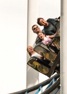 I quite enjoy roller coasters, or the pirate ship, but am not a fan of anything that spins, and so was not too disappointed when Megan proved too short for The Edge, a sort of giant spinning roller coaster. Megan, on the other hand, was very disappointed, having convinced herself that this would be the first visit when she would be tall enough, and it really wasn’t fair that Bridget had an extra ride. When Bridget and Grannie decided on a second ride, Megan and I headed for the Cobra roller coaster, which we had both enjoyed before (when Grannie sat behind us shouting “This is horrible, this is horrible…..”).