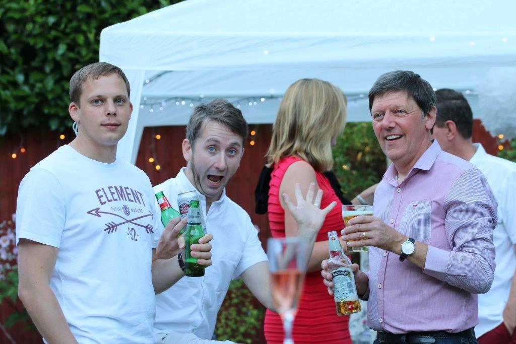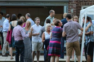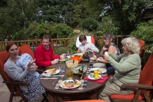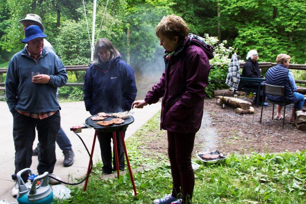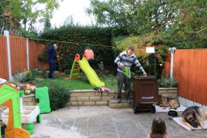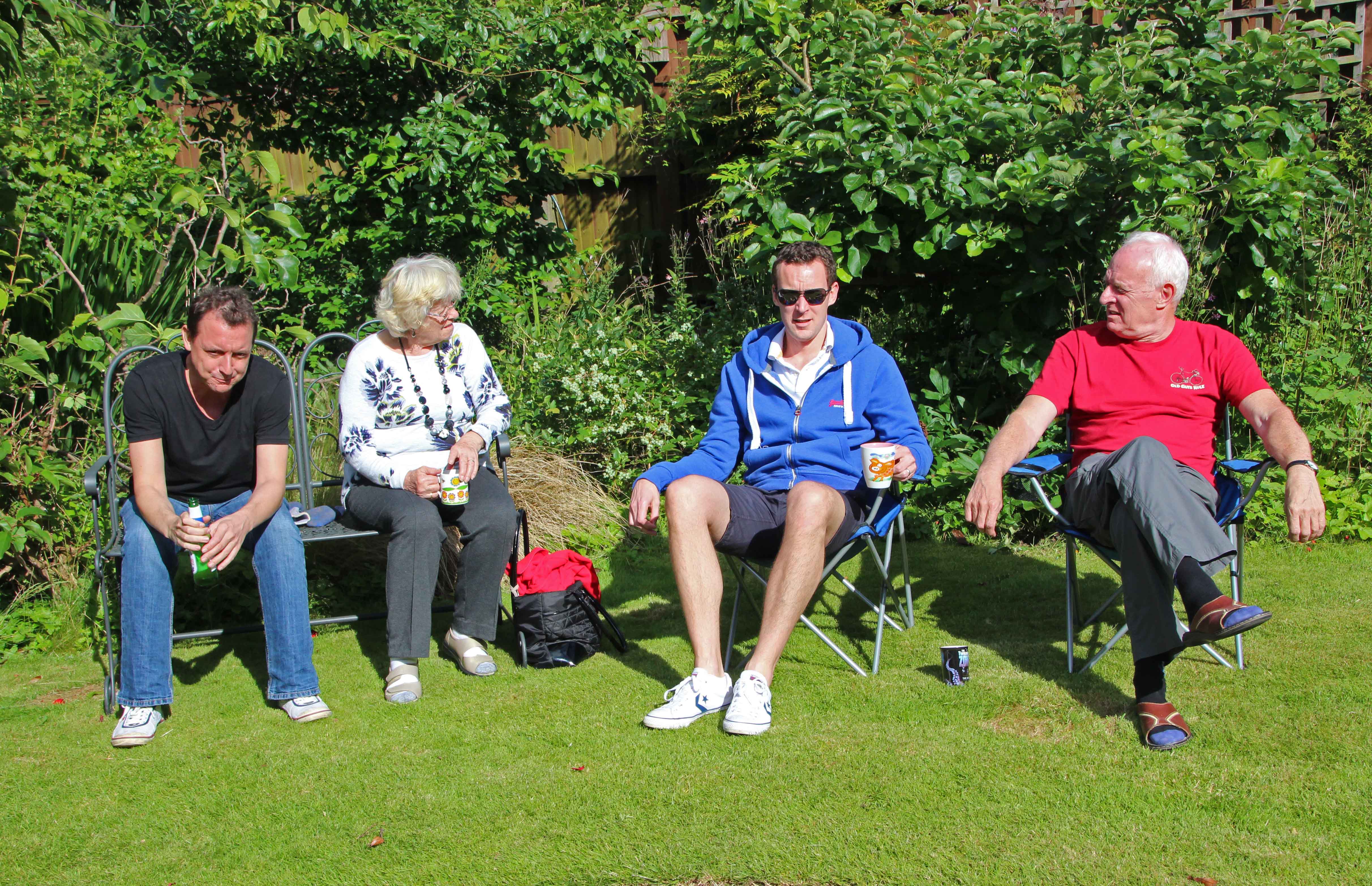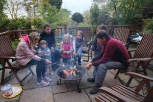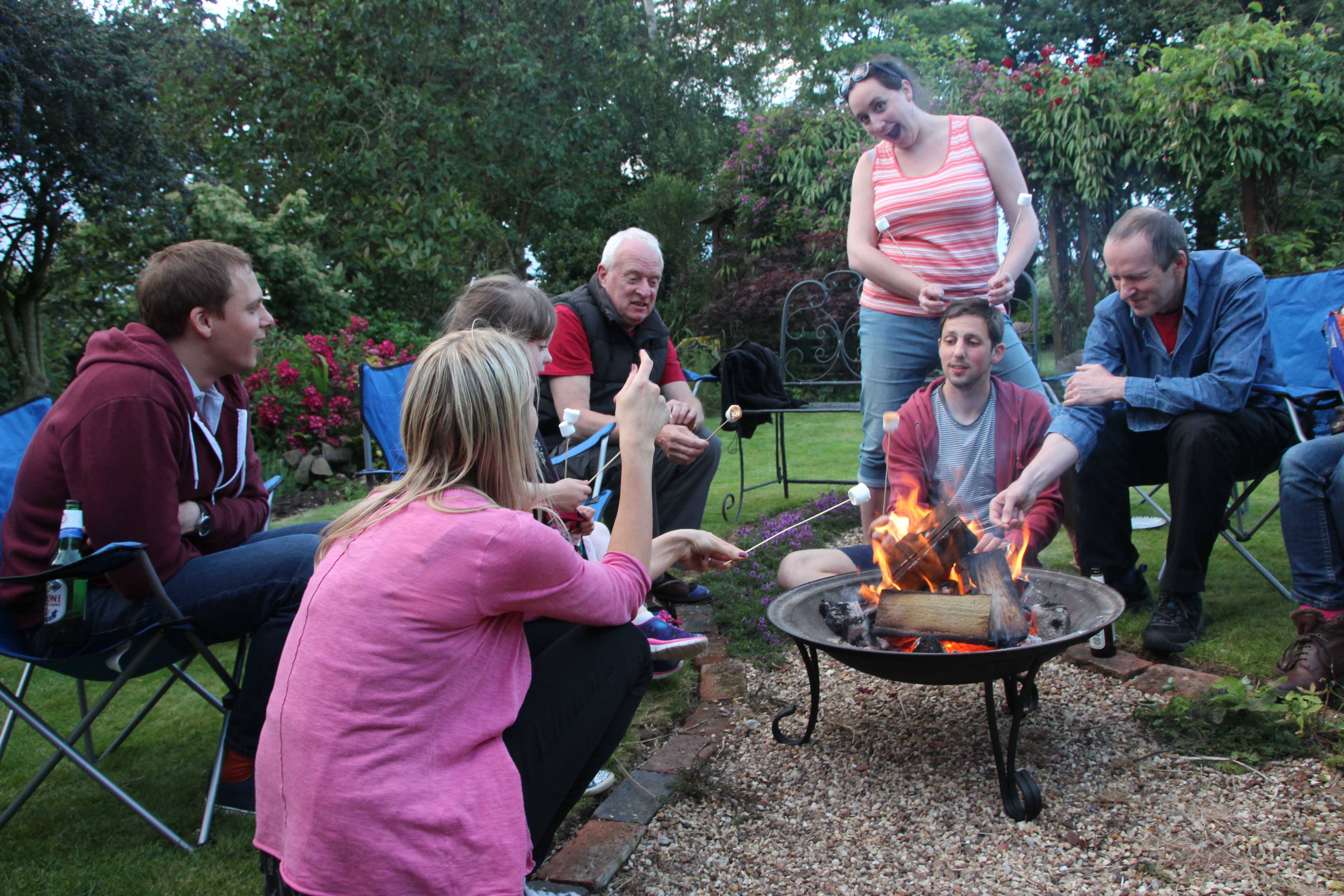 Chantal served a large bowl of chilli and a large bowl of lasagne on the garden table set up under the gazebo, quite snug during the gusty showers. The rain stopped in time for the children to play in the garden, ably assisted by the grown-ups, while Chantal cooked a barbeque. Kate supplied some excellent puddings, including my favourite – cheesecake. As the shadows lengthened we lit the fire pit, all sitting around it on the patio, chatting, and toasting marshmallows on a stick.
