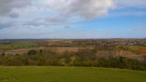 On Saturday evening I finished a walk with Tia by climbing Croft Hill, stopping to chat with another dog walker at the top. I had heard the roar of a combine as a climbed the slope, and from the “summit” could see that a combine was working the field behind our house, moving clockwise around the field edge at the start of a series of ever decreasing circles.