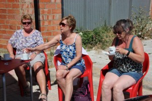 I think Chantal must have taken the photo of her card display above (with Andree and her friend, who spent most of the day with us and our neighbours) before the gardens opened for the day, since the garden was busy with visitors from shortly after opening at 10.000am, until just before closing at 6pm. After two days of intensive gardening I told Chas that the actual open day would be a relaxed affair, just sitting in the sunshine watching folk wonder around the garden, but I had forgotten how much people like to chat. It took me two hours to eat the ploughmans lunch that I brought back to our garden from three doors away. And of course Chantal was busy keeping the greetings card display stocked up.