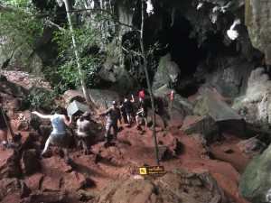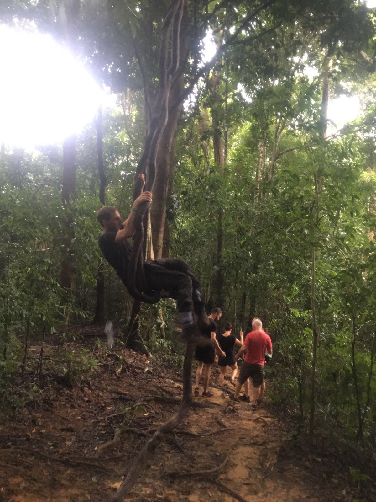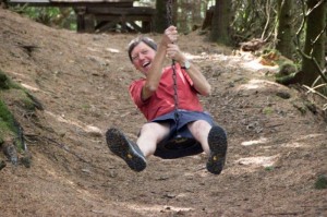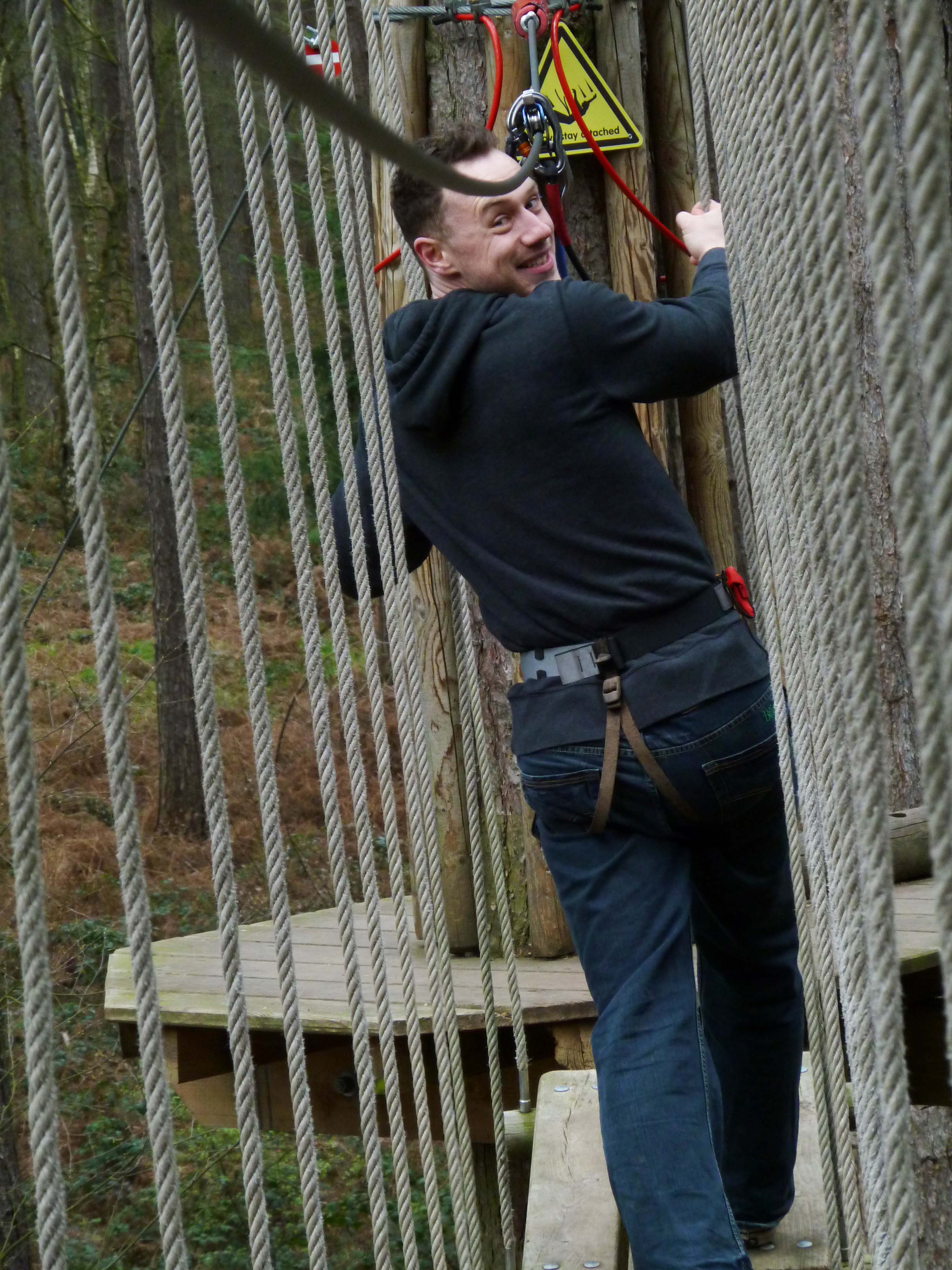 Each stage basically followed the same routine – climb a rope ladder to a platform around a tree trunk, and step off the platform onto various rope-bridge contraptions strung between the trees linking to the next platform (after processing the coloured karabiners in the correct order). There were about half a dozen bridges to each stage,  some with suspended steps that had a habit of swinging away from your feet, some with tunnels of rope netting, some including a high level Tarzan swing across to a rope net, to be climbed to reach the next platform. At the end of each stage a lengthy zip wire delivered you back to ground level – despite my every effort I always arrived at the bottom going backwards.