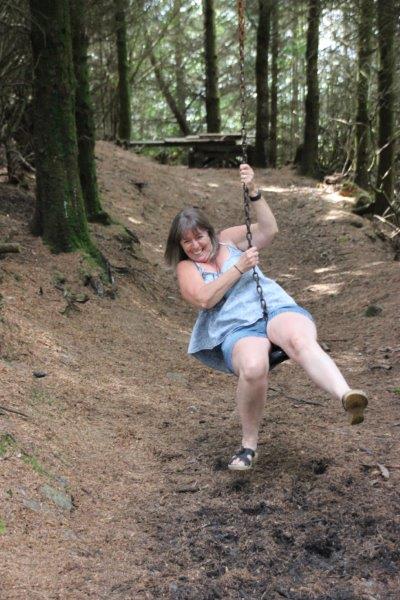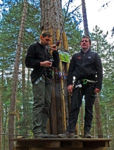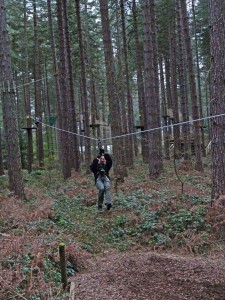 After a brief lunchbreak it was time for Go Ape. I’d seen the course, which didn’t look too bad, and was feeling quietly confident. And then it became clear that I had been looking at the junior course. Once again we signed to say we knew that we were about to embark on a risky venture, and we had a training session on the first of five individual stages high above the ground. The training basically involved demonstrating how we must always be clipped onto the safety wires by at least one of three karabiners. I’d done this karabiner stuff before, having been dragged up several rock faces by a safety rope, sweating and trembling, by my “mates”, but this was more complicated and involved colour co-ordination.  Clip pulley to safety wire, release blue karabiner from previous safety wire, clip blue safety wire to pulley, release red karabiner from previous safety wire, clip red karabiner to next safety wire, and off you go, unless the next stage is a Tarzan swing, which then involved the green karabiner. No-one colour blind should try GoApe.