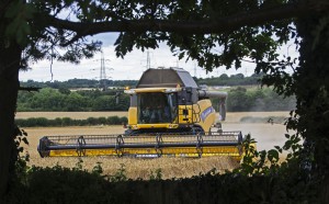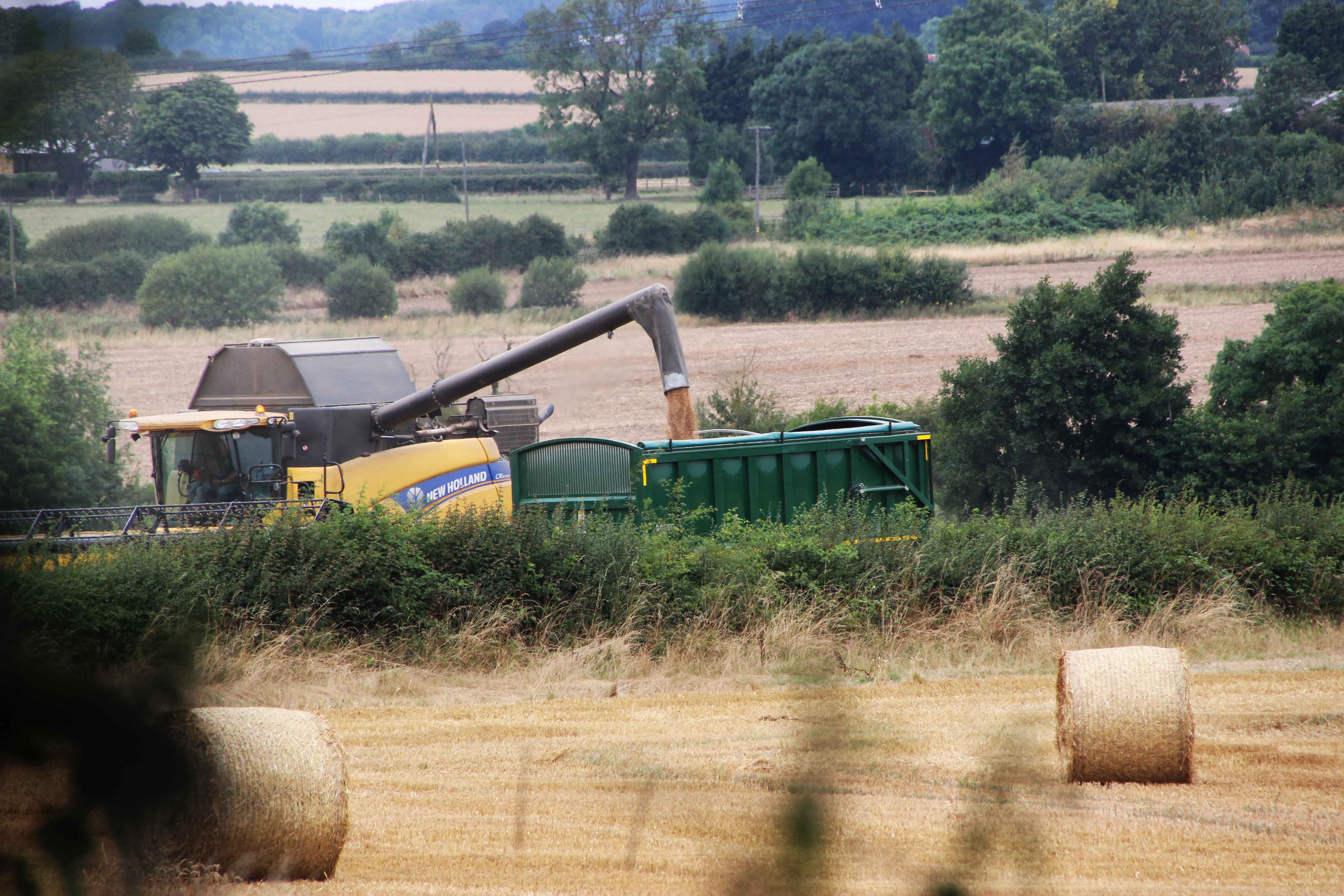 By Sunday lunchtime the field was harvested, the straw rolled into giant bales, and the harvester was emptying grain into a trailer on the next field.