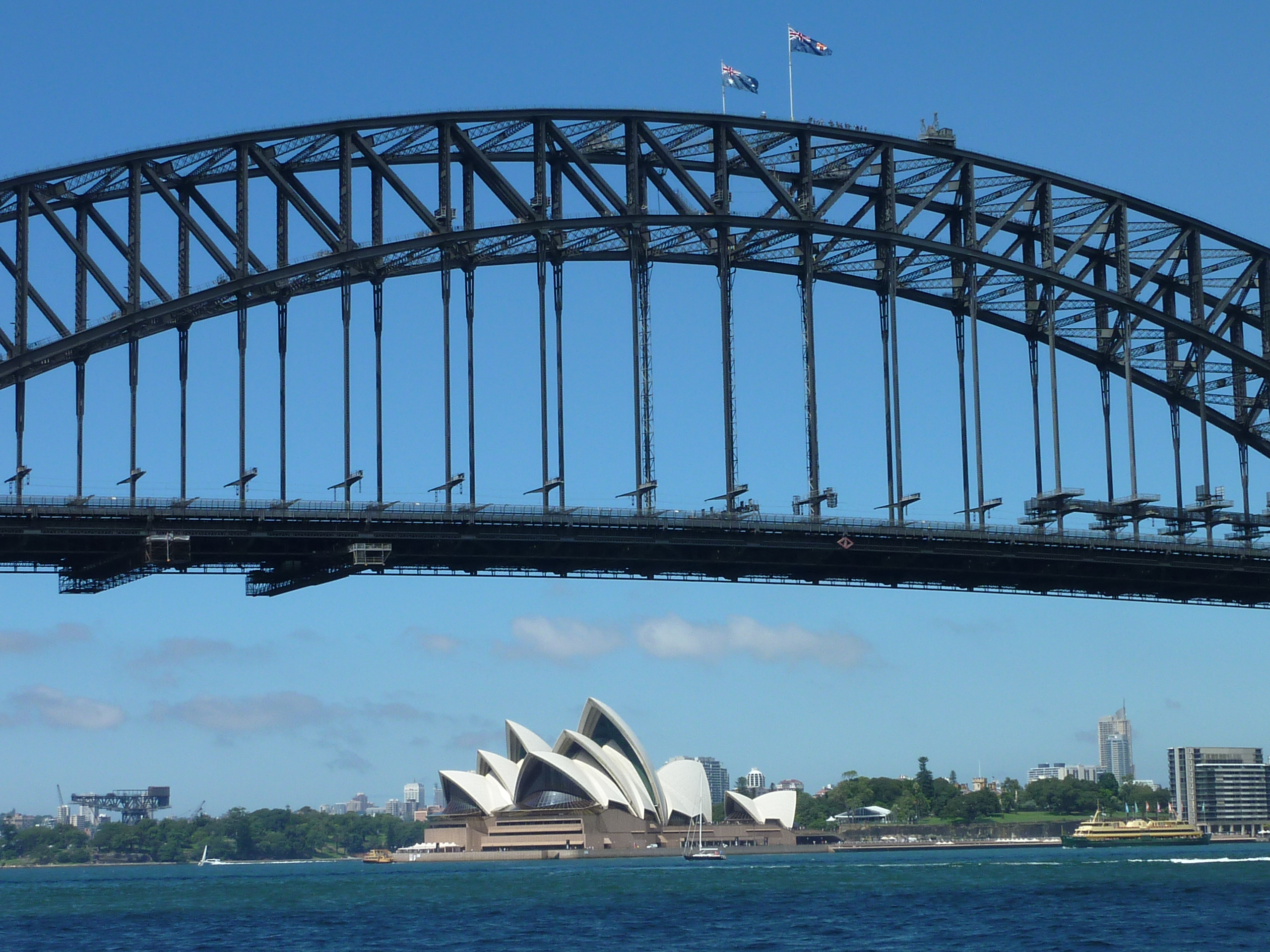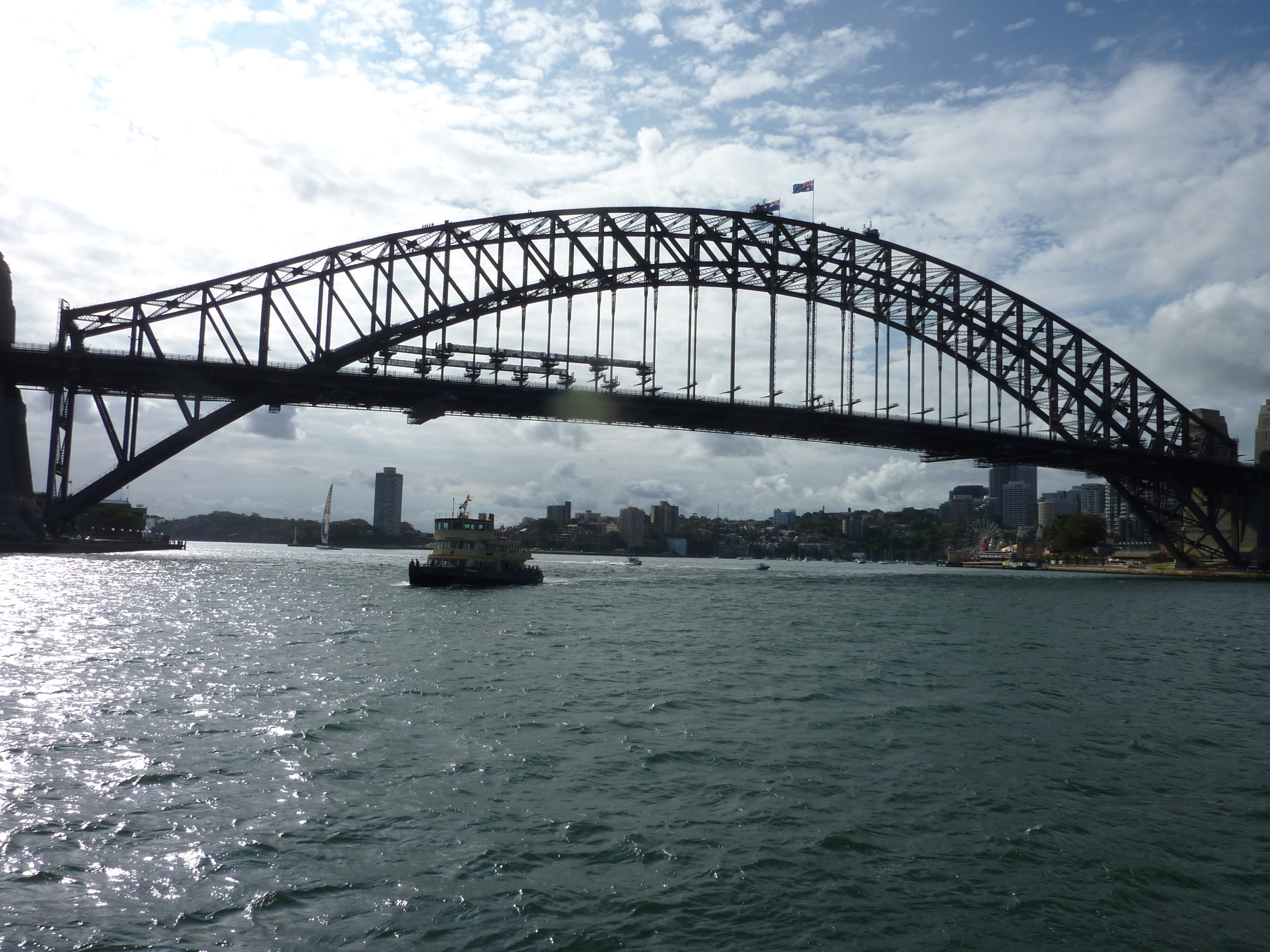 The train approaches the station through a tunnel, and so there is no view until it arrives. The raised platform is open to the Harbour. In front of us was the huge harbour, glittering under a blue sky. To the right was the Sydney Opera House, and to the left, dominating the whole scene, was the Sydney Harbour Bridge, soaring up, much bigger than I expected. It was an amazing feeling – this view was so familiar from pictures, but at the same time was nothing like any photograph. I can’t really explain why – I suppose it was the whole experience, the details that cannot be appreciated from a photograph. The anticipation, the unexpected view of the harbour with such iconic structures all in one scene, the ferries crossing the harbour, the smell of the sea, the activity on the harbour front, the music from aboriginal street entertainers playing didgeridoos for the tourists. All this hits you in one moment as you get off the train. Not surprisingly it was love at first sight.