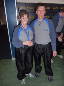 We booked in, and were eventually invited through a door where each of us introduced ourselves to the rest of our party – about ten people in total. I think that we were the only Brits. Barbara, our climb leader, gave us a brief talk on what to expect, breath-tested each of us (Chris and I had abstained all day – the merest hint of alcohol would have precluded us from the climb) and we completed a health declaration and disclaimer. She issued us with overalls, waterproofs in a pouch, and an optional hat. Since it was warm and humid, just underwear under the overall was recommended. The hat and waterproofs were clipped to the overalls, so that they couldn’t become detached. No jewellery, other than rings, was allowed, and absolutely no cameras or anything else that could possible fall from the bridge summit and give a passing ship captain a headache.