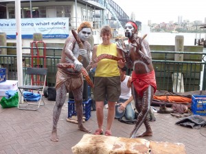 Back at Circular Quay, the aboriginal toe-tapping entertainers were hard at it, encouraging tourists to have a photo taken with them in return for an unspecified donation. Chas and Chris did so, and I bought a CD, before we walked along the edge of The Rocks and into the City.